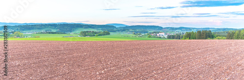 Rural agricultural landscape. Red soil fields around Nova Paka, Czech Republic