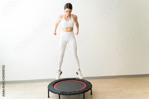 Pretty Young Woman In White Sportswear Jumping On Trampoline