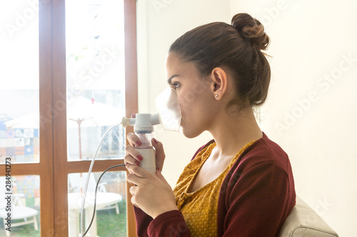 Young woman doing inhalation nebulizer in hospital, holding a mask nebuliser inhaling asthma and bronchitis medication to improve breathing. Healthcare, medicine, disease concept.