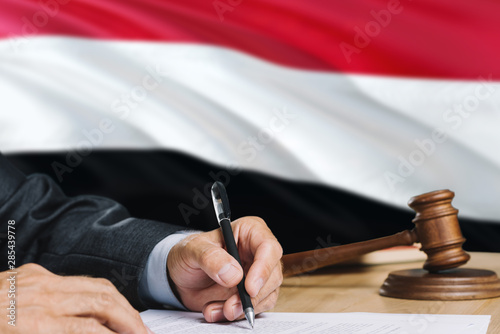 Judge writing on paper in courtroom with Yemen flag background. Wooden gavel of equality theme and legal concept.