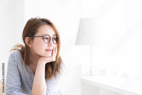 Young latin woman sitting on the table by christmas decor looking confident at the camera smiling with crossed arms and hand raised on chin. thinking positive.