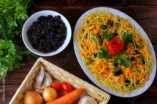Salpicao is a typical Brazilian salad, made with shredded chicken, raisin, grated carrot, potato sticks and mayonnaise.