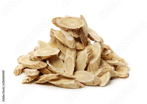 Chinese Herbal medicine - Astragalus slices, Huang Qi (Astragalus propinquus) on white background