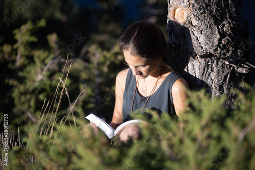 Chica adolescente leyendo un libro el exterior junto a un árbol
