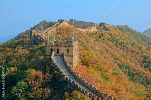 DRONE: Scenic drone shot of the Great Wall running along the mountains in China.