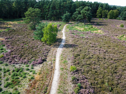 Aerial view of a path in heath land and heather