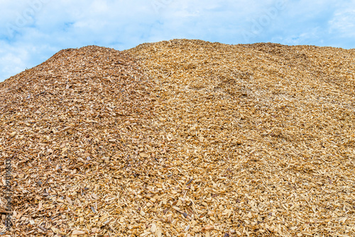 A large pile of wood chips lying on a square, with a blue sky in the background.
