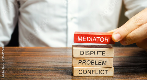 A man holds wooden blocks with the word Mediator, dispute, problem, conflict. Settlement of disputes by mediator. Dispute Resolution and Mediation. Third party, intermediary.