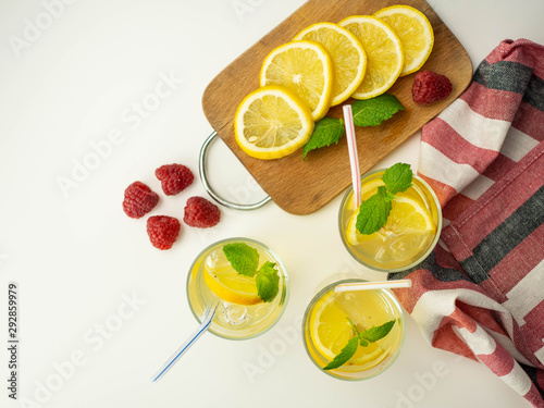 Świeża lemoniada z cytryną, malinami i miętą. Widok z góry.
