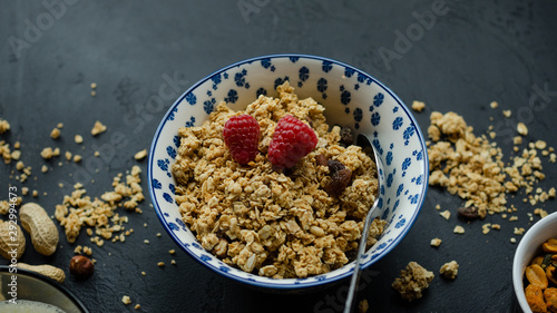 Musli z orzechami i malinami. Czarne tło, widok z góry.