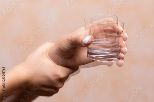A closeup view on the hands of a person trying to hold a glass of water steady, shaking hands symptomatic of a central nervous and motor system disease such as Parkinson's