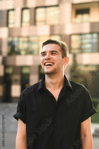 Smiling male model in stylish casual clothes posing at camera against the backdrop of a modern building looking upside down with a positive face. Handsome guy standing on urban background and smiling
