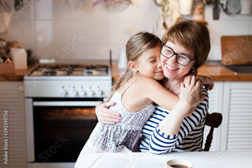 Happy mother is hugging daughter in cozy home kitchen. Woman and cute child girl are smiling. Family is using oven. Kid is enjoying kindness, embrace, care, support. Lifestyle authentic moment.