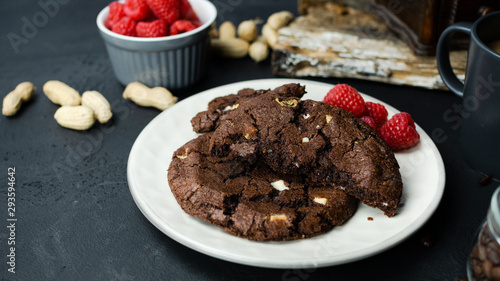 Czekoladowe ciasteczka na ciemnym tle. Widok z góry.