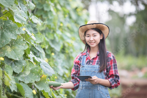 Asian women Agronomist and farmer Using Technology for inspecting in Agricultural and organic vegetable Field .