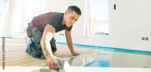 männliche Arbeitskraft, die mit selbstnivellierendem Zementmörtel während der Bodensanierung arbeitet