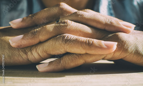 Black woman interlacing fingers. Hands clasped. Analog effect.