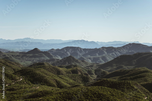 Colorful mountains far away with a clean and blue sky