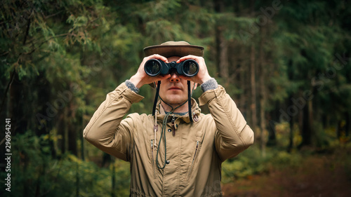A man in a hat and uniform green and beige holds binoculars and looks into the distance, Ranger watching the territory, the protection of the reserve