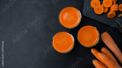 Sok marchwiowy świeżo wyciśnięty. Ciemne tło, widok z góry.