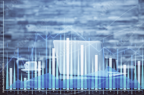 Stock market graph on background with desk and personal computer. Multi exposure. Concept of financial analysis.