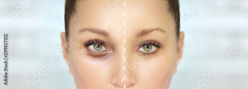 Lower and upper Blepharoplasty.Marking the face.Perforation lines on females face, plastic surgery concept.
