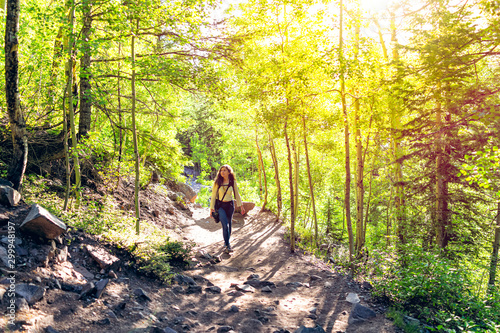 Maroon Bells Crater Lake hike with woman climbing steep dirt road in Aspen, Colorado in July 2019 summer