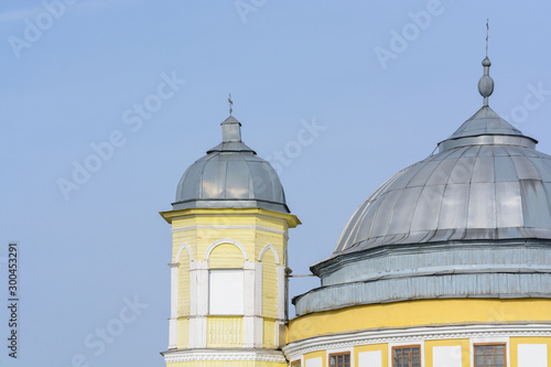 The church is a two-tier stone-rotunda temple with a hemispherical dome on a step drum, as well as an octal bell tower with a faceted dome. Temple rotunda