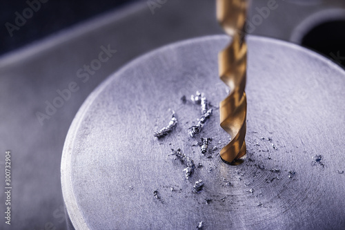 metal drill bit make holes in steel billet on industrial drilling machine with shavings. Metal work industry. multi cutting tool and end mill.