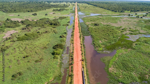 Aerial view of Transpantaneira dirt road crossing straight the typical landscape of North Pantanal Wetlands, Mato Grosso, Brazil