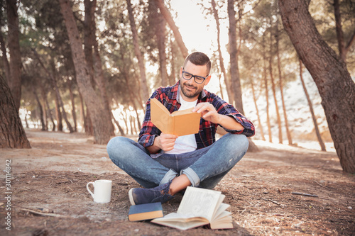 Hombre joven con lentes y camisa de cuadros, sentado en el suelo en medio del bosque, leyendo sonriente un libro al aire libre