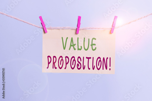 Word writing text Value Proposition. Business photo showcasing innovation service intended make product attractive Clothesline clothespin rectangle shaped paper reminder white wood desk