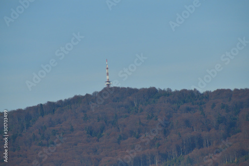 Radio and television transmitter rises above the woods