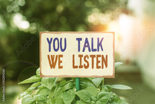 Text sign showing You Talk We Listen. Business photo text Two Way Communication Motivational Conversation Plain empty paper attached to a stick and placed in the green leafy plants