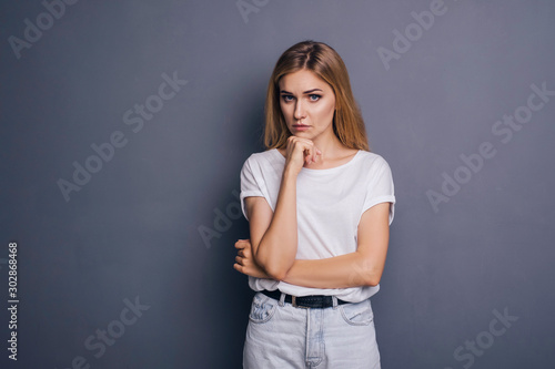Caucasian woman in neutral casual outfit standing on a neutral grey background. Portrait with emotions: angry, pain, sickness and despair