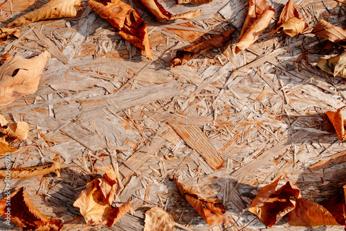 yellow shadow sun light wet autumn leaves background old wood wooden copy space red