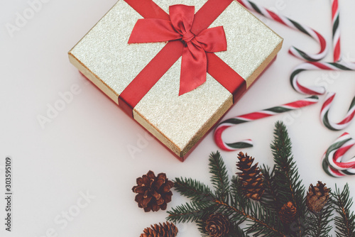 Christmas concept, new year concept. Gift Box, candy staff,candy canes Christmas tree branches. Fir tree branches,close up.Toned.White background.