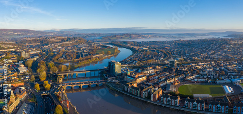 An aerial view at sunrise of Newport city centre, south wales United Kingdom, taken from the River Usk