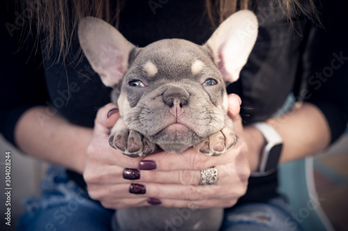Sleepy French blue bulldog puppy face held in a woman's hands