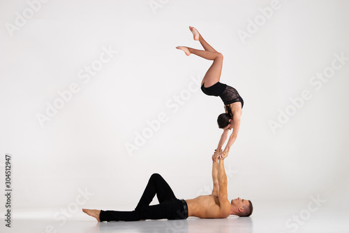 Duo Of Acrobats Showing hand to hand Trick, Isolated On White