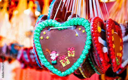 Heart shape Gingerbread cookies food on Christmas market in Europe in winter. German Night street Xmas and holiday fair in European city or town, December. Gendarmenmarkt in Berlin, Germany