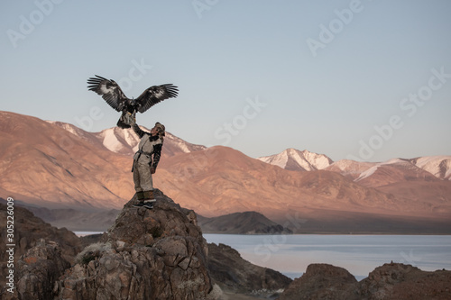 Portrait of a young kazakh eagle hunter with his majestic golden eagle in the steppe. Ulgii, Mongolia.