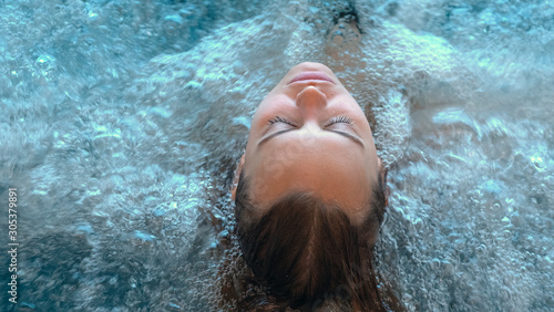 Close up of an young female is enjoying and having relax in a whirlpool bath tube in a luxury wellness center.