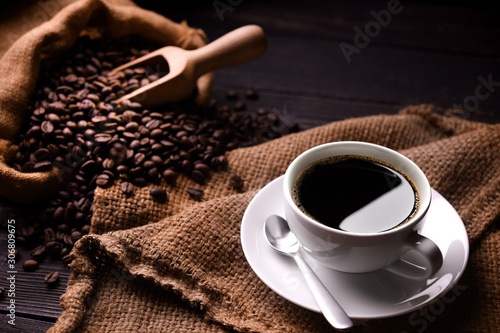 Cup of coffee and coffee beans in burlap sack on old wooden background