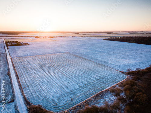 Aerial view of agricultural fields covered in first snow - Early winter scenery with sunrise in background