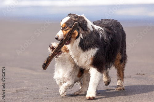 Perro grande y perros pequeño disputándose un palo en la playa