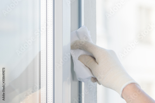 the hands of the master show how to care for plastic windows by rubbing the rubber bands