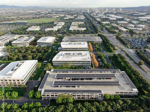 Aerial view of business and finance district with new office building surrounded by parking and road. Irvine Business Complex. Irvine California. USA