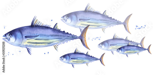 School of Striped tuna, Skipjack tuna. Watercolor illustration fish on white background