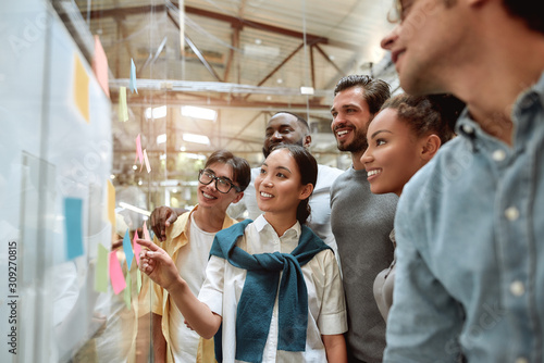 Improving productivity at work. Side view of young and positive business people in casual clothes looking at colorful sticky notes on a glass window while standing in the modern office